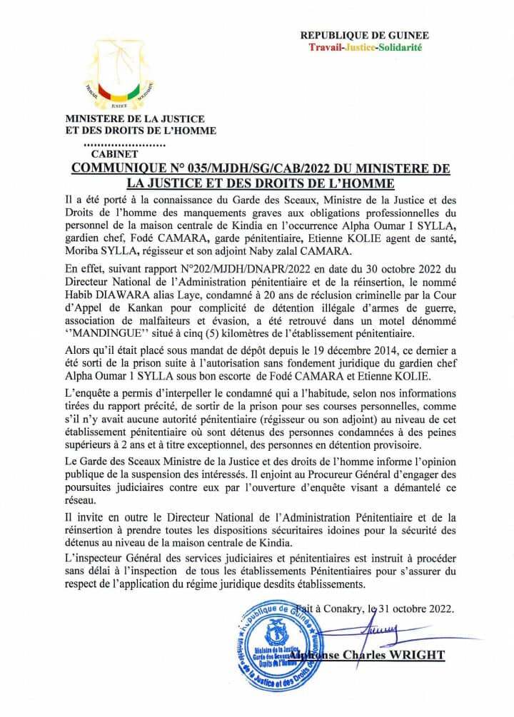 Charles Wright, ministre de la Justice et garde des sceaux, a annoncé ce lundi, 31 octobre, la suspension de quelques responsables de la maison centrale Kindia et ordonné des poursuites judiciaires contre eux pour manquements graves aux obligations professionnelles.