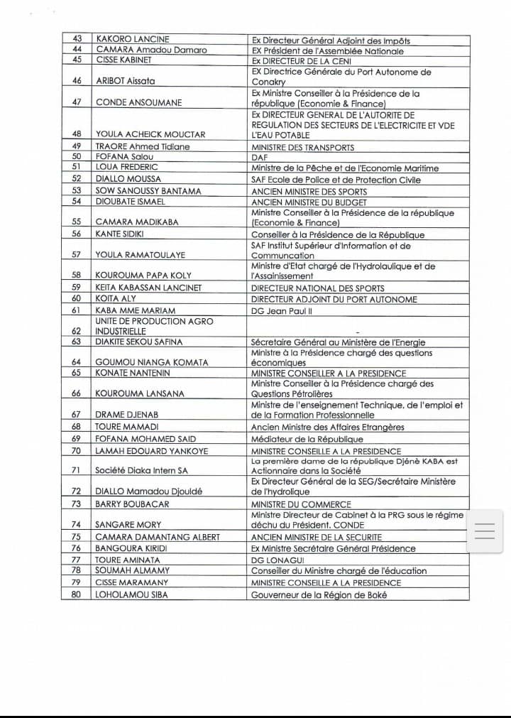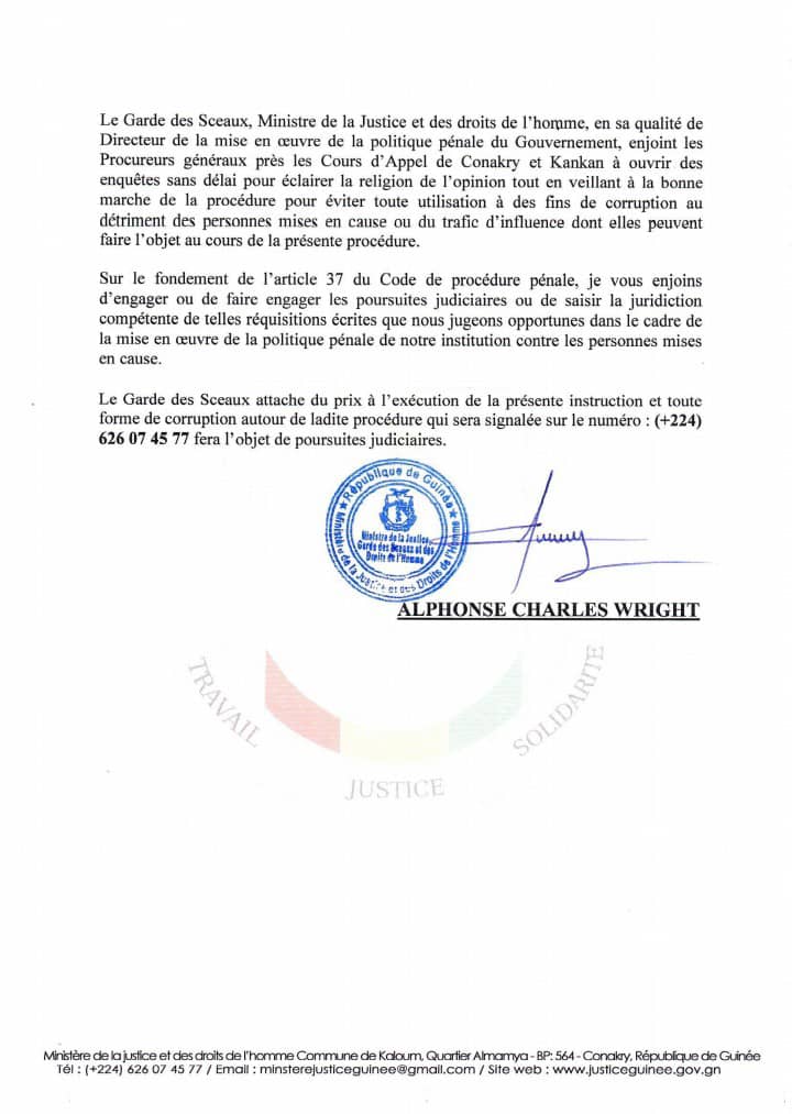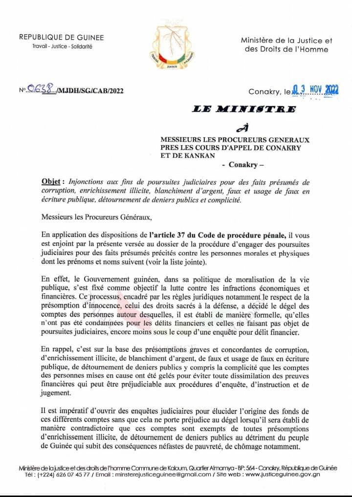 Dans une correspondance qu’il a adressée ce jeudi 3 novembre 2002, aux procureurs généraux des Cours d’appel de Conakry et Kankan, le ministre Alphonse Charles Wright ordonne d’engager des poursuites judiciaires contre l’ancien président Guinéen, le président Alpha Condé, et 188 personnalités dont l’ancien prémier ministre Kassory Fofana, Dr Mohamed Diané, ancien monistre de la défense nationale, tous détenus à la maison centrale de Conakry, et le désormais feu Claude Kory Kondiano, ancien président de l’Assemblée nationale pour des faits présumés de corruption, enrichissement illicite, blanchiment d’argent, faux et usage de faux en écriture publique, détournement de deniers publics et complicité.
