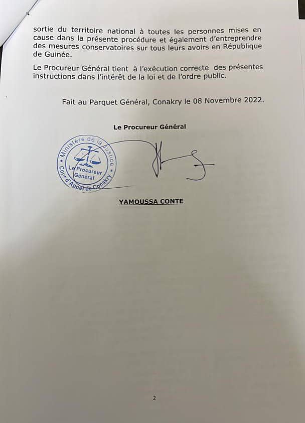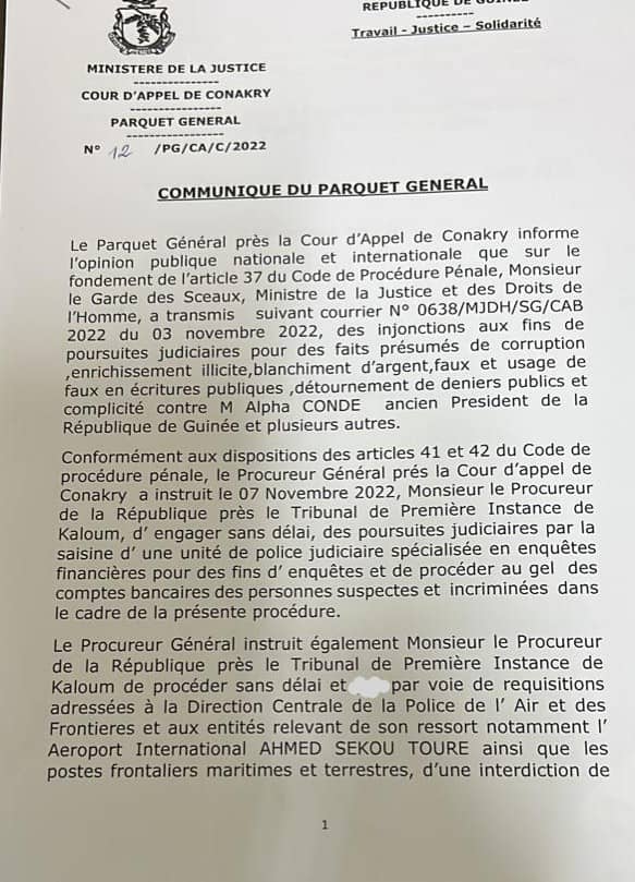 Dans un communiqué du parquet général dont nous avons reçu copie, le Procureur Général a instruit le Procureur de la République près le Tribunal de Première Instance (TPI) de Kaloum, de procéder sans délai à l’interdiction de sortie du territoire de l’ancien président Alpha Condé et plusieurs autres.