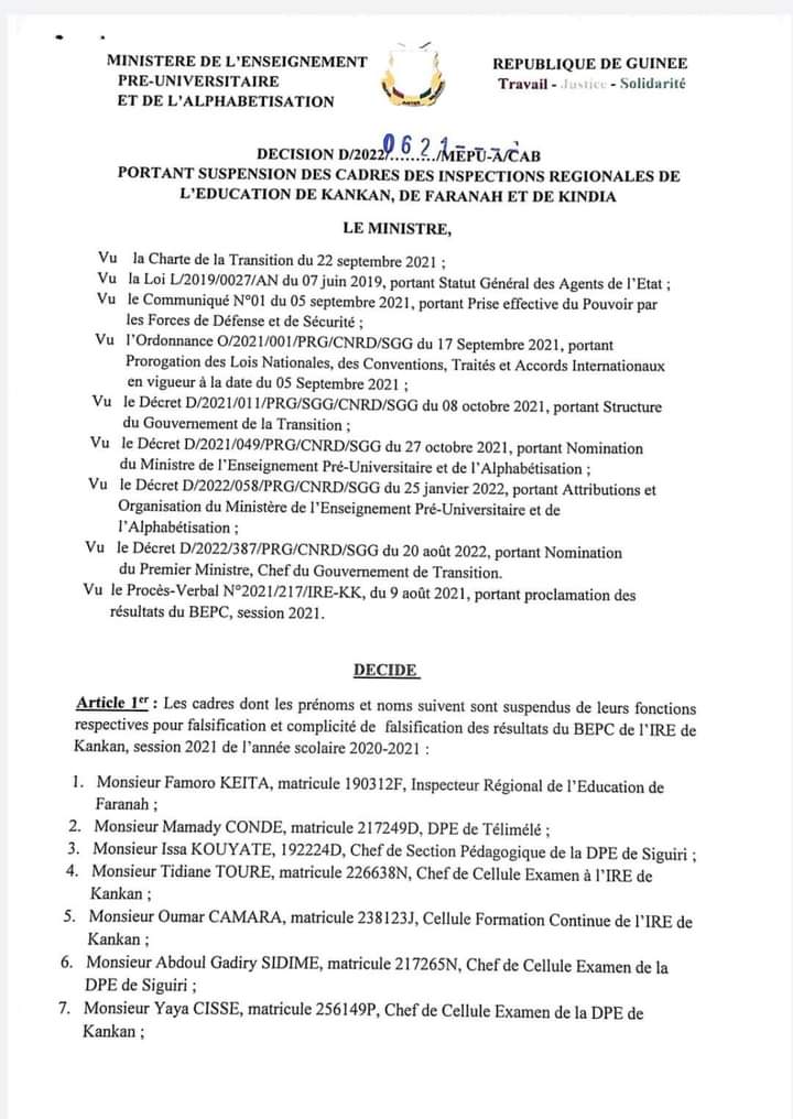 Faux et usage de faux sur la liste des admis au BEPC session 2021( avant le CNRD), le Ministre Guillaume HAWING suspend plusieurs cadres de leurs fonctions.