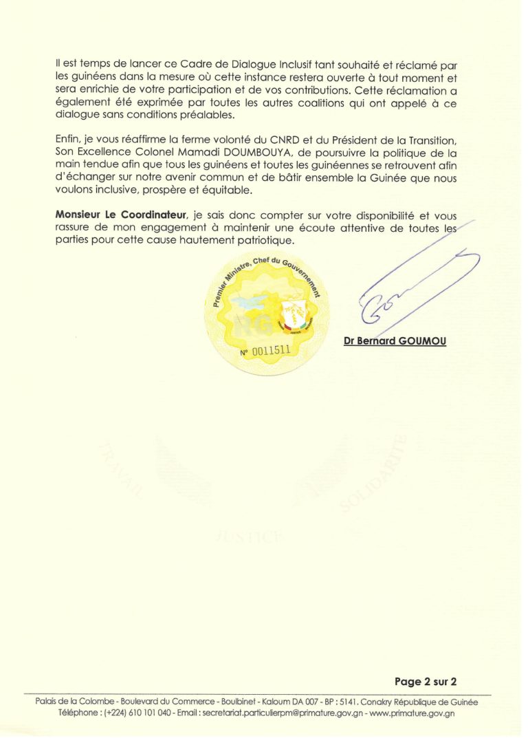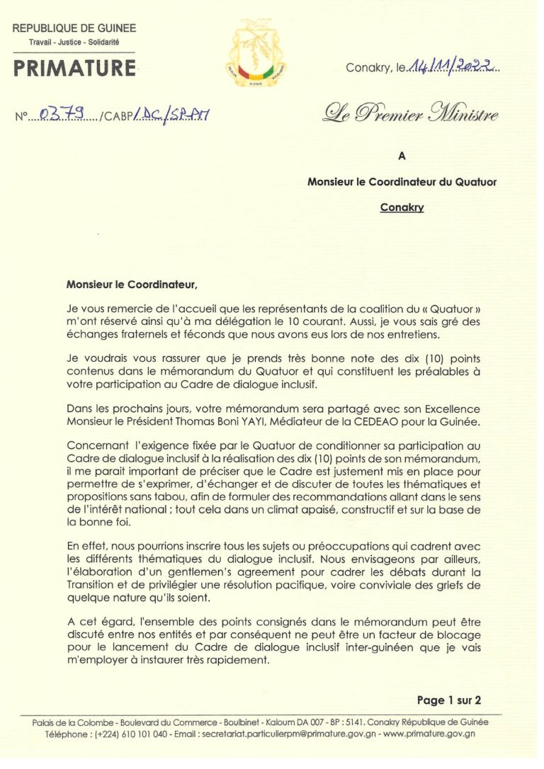 Dans un courrier qu’il a adressé aux différentes coalitions politiques formant le quator, en reponse au mémorandum desdites coalitions, le premier ministre Dr Bernard Gomou leurs a assuré que dans les prochains jours, leur mémorandum sera partagé avec le médiateur de la CEDEAO, et que toutes les thématiques et propoitons seront discutés.