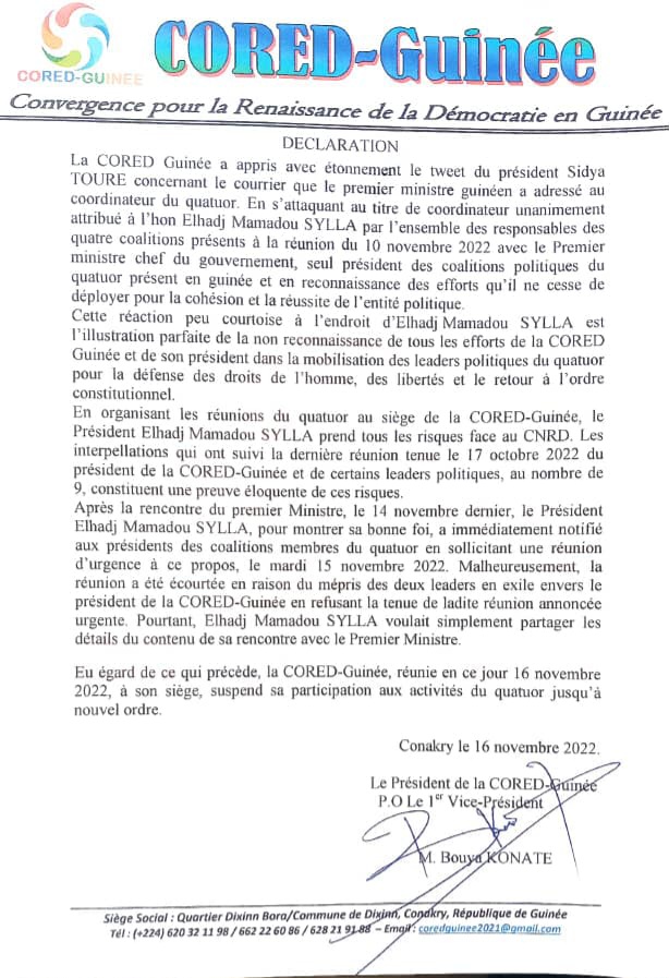 A travers une déclaration que nous avons reçus, la CORED-GUINÉE dirigée par Elhadj Mamzdou Sylla a, annoncé la suspension de sa participation aux activités du Quatuor jusqu’à nouvel ordre. Une décision qui fait suite au courrier reponse que le premier ministre, Dr Bernard Gomou a écrit au Quator dans le cadre du dialogue politique Guinéen, en s’adressant au Coordinateur dudit quator.