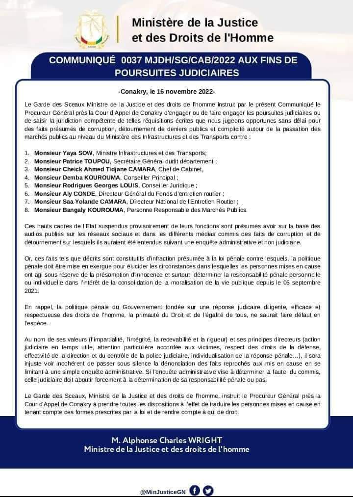 A peine limogé par le colonel Mamadi Doumbouya, président de la transition pour raison d’ouverture d’enquête judiciaire devant la Cour de répression des infractions économiques et financières (CRIEF) en date du mardi 15 novembre 2022, le ministre Alphonse Charles Wright a, à travers un communiqué, instruit des le procureur près la Cour d’Appel de Conakry, d’engager ou de faire engager des pour suite contre le désormais ex ministre du transport ainsi les 7 de ses collaborateurs.