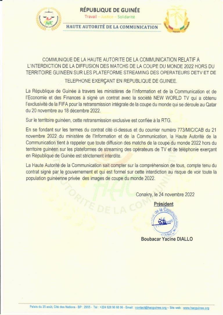 La Haute autorité de la Communication (HAC),  a dans un communiqué rendu public ce vendredi 24 novembre, interdit toute diffusion des matchs de la Coupe du monde Qatar 2022 hors du territoire guinéen sur les plateformes streaming des opérateurs TV et de téléphonie exerçant en Republique de Guinée.