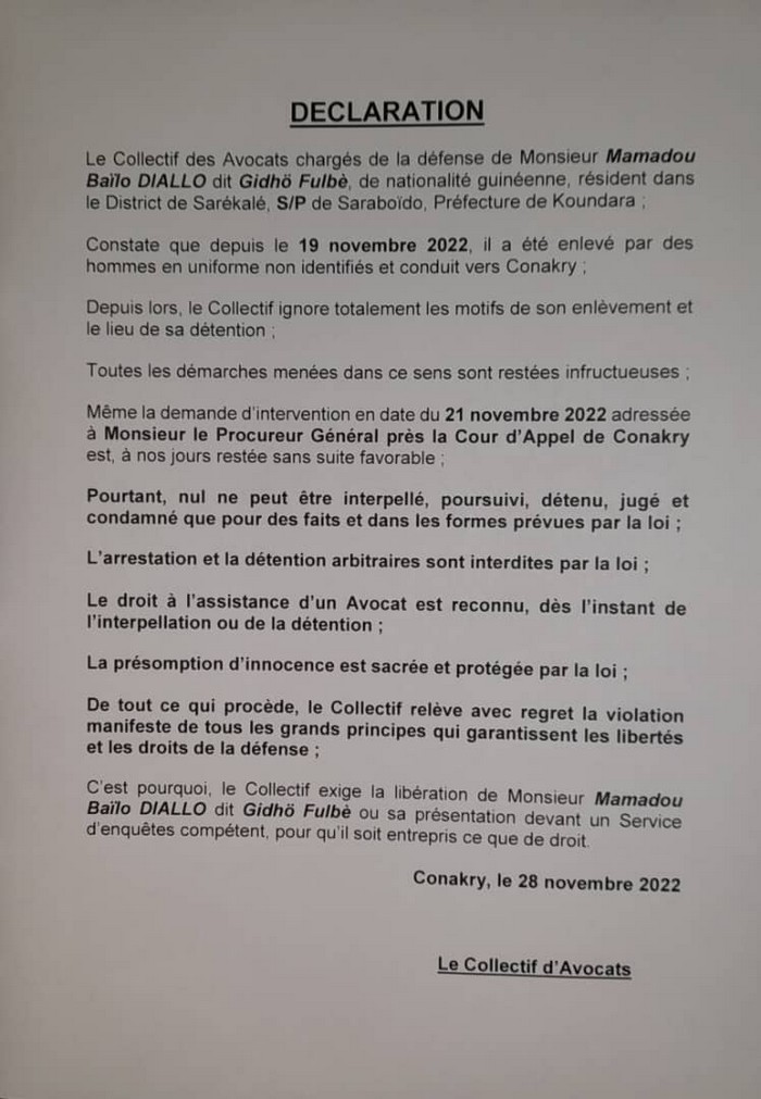 Le jeune blogueur Mamadou Baïlo Diallo, alias Guidhö Fulbhè, arrêté le 19 novembre dernier à Koundara se trouve jusqu’à ce jour à un lieu inconnu de ses avocats, et les raisons de son arrestations non plus, non jusque-là pas été officialisées.