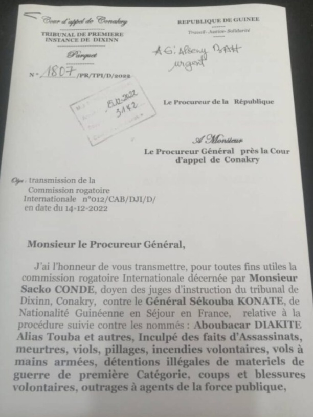 C’est une information des dernières minutes pour nous. A travers un document signé du procureur Algassimou Diallo, et dont nous avons reçu copie, une commission rogatoire internationale a été décernée contre l’ancien président ministre de la défense sous CNDD, et ancien président de la transition Guinéenne, le Général Sékouba Konaté, citoyen Guinéen résident en France, dans le cadre des évènements douloureux du 28 septembre 2009.