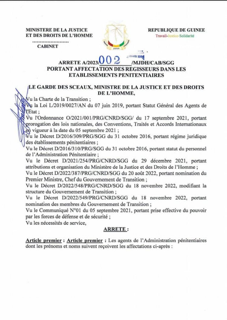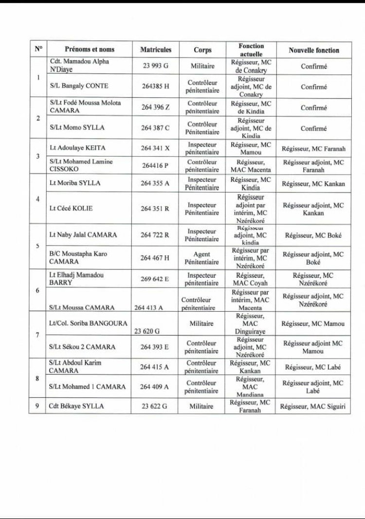 Ce mercredi, 04 janvier 2023, le ministre de la justice Guinéenne, Alphonse Charles Wright a procédé à la réaffectation des régisseurs dans certains établissements pénitentiaires du pays. Cela, pour certainement éviter la sédentarisation des gardes pénitentiaires.