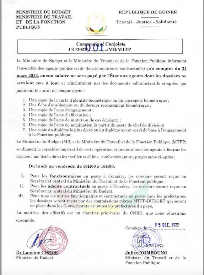 Dans un communiqué conjoint des Ministère du budget et de la Fonction et du travail, et dont nous avons reçus copie,  il est porté à la connaissance des agents publics civils( fonctionnaires et contractuels) qu’à compter du 31 mars 2023, « aucun salaire ne sera payé par État aux agents dont les dossiers ne seraient pas à jour et n’incluraient pas les documents administratifs cités dans le communiqué, qui justifient le statut de chaque agents: