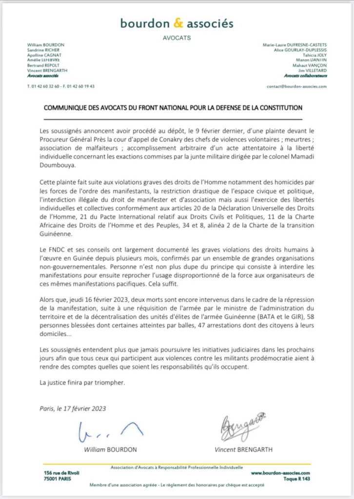 Les Avocats du FNDC engagent des actions judiciaires contre la junte militaire en Guinée (Copie) DROIT & JUSTICE Par Hassane Le 17 Fév, 2023 | 21 h 04 min Partager Post Views: 433 A lire aussi : Désinformation en Guinée : le Parquet Général hausse le ton… 4 Déc, 2025 | 22 h 35 min Cellou Dalein Diallo contre l’État guinéen : ses avocats… 25 Nov, 2025 | 17 h 53 min Partager :FacebookXJ’aime ça :J’aime chargement… Articles similaires Partager
