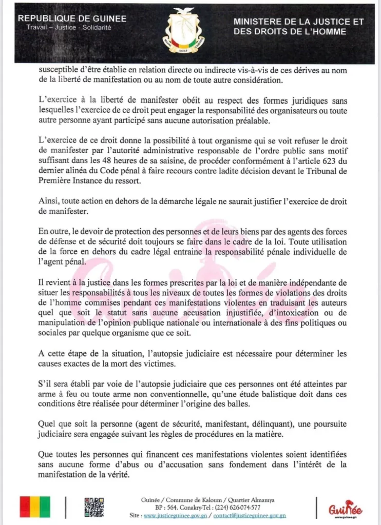 En ma qualité du directeur de la politique pénale du Gouvernement basée sur la lutte contre l’impunité sous toutes ses formes et en ma qualité de Ministre des Droits de l’Homme, je ne saurais garder silence sans ordonner des poursuites judiciaires contre toutes les personnes physiques ou morales dont la responsabilité présumée est susceptible d’être établie en relation directe ou indirecte vis-à-vis de ces dérives au nom de la liberté de manifestation ou au nom de toute autre considération.