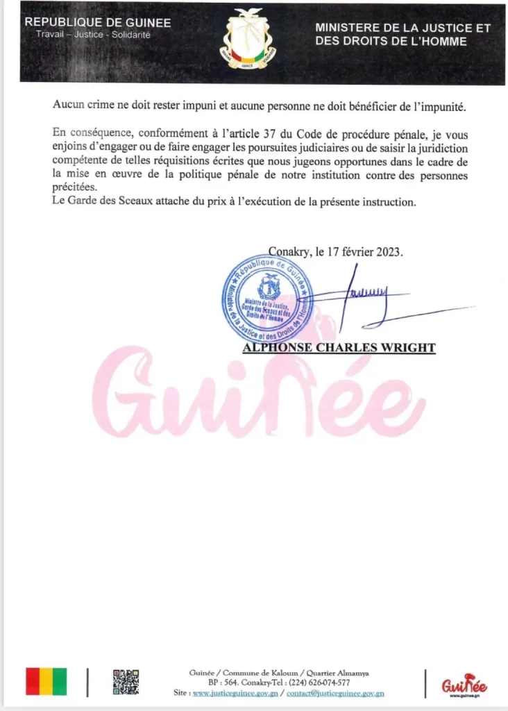 En application des dispositions de l’article 37 du Code de procédure pénale, il vous est enjoint par la présente versée au dossier de la procédure d’engager des poursuites judiciaires pour des faits précités contre Sékou KOUNDOUNO et autres.