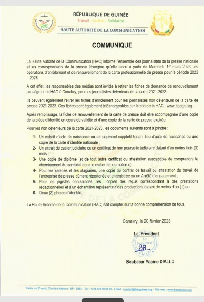 Renouvellement de la carte de presse Professionnelle 2023-2025 en Guinée: le processus démarre à partir du 1er mars prochain (communiqué) société Par Alhassane Toure Le 20 Fév, 2023 | 12 h 04 min Partager Post Views: 715 A lire aussi : Départ à haut risque : des Guinéens empruntent une nouvelle… 5 Déc, 2025 | 15 h 42 min Mobilisation nationale pour l’assainissement : le… 5 Déc, 2025 | 13 h 47 min Partager :FacebookXJ’aime ça :J’aime chargement… Articles similaires Partager