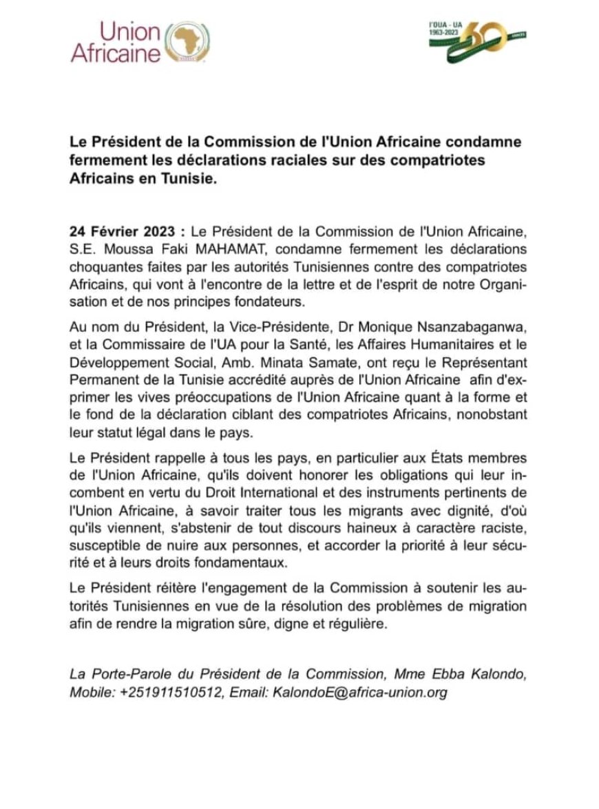 L’Union Africaine condamne les propos ‘’racistes’’ du président tunisien, Kaïd Saïed (communiqué) Afrique Par Hassane Le 25 Fév, 2023 | 21 h 51 min African Union Flag with Flat European Union Flag and large Gradient Double Flag - 3D illustration - 3D render Partager Post Views: 866 A lire aussi : Côte d’Ivoire : Ouattara démarre son 4e mandat en… 8 Déc, 2025 | 16 h 22 min Burkina Faso : le gouvernement rétablit la peine de mort… 6 Déc, 2025 | 7 h 56 min Partager :FacebookXJ’aime ça :J’aime chargement… Articles similaires Partager