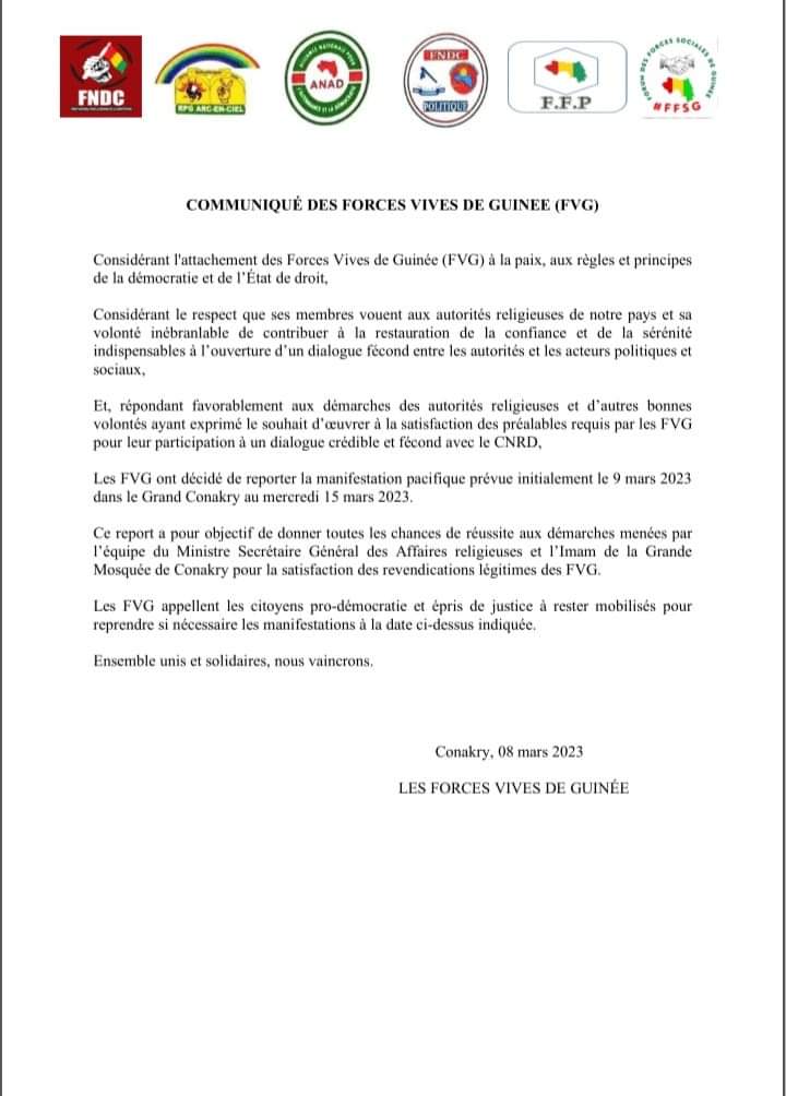 C’est une information de dernière minute ! Alors qu’ils étaient prêts à braver l’interdiction de manifester des autorités demain jeudi, nous venons d’apprendre que les forces vives de la nation ont décidé de reporter leur manifestation au mercredi prochain grâce à l’implication des religieux.