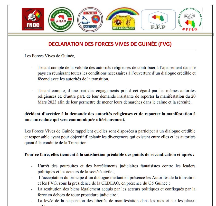 Guinée : La déclaration des FVG sur les repport de la manif de demain Politique Par Alhassane Toure Le 19 Mar, 2023 | 13 h 40 min Partager Comme annoncé hier, les forces vives de Guinée ont accédés à la demande des des autorités religieuses du pays, à savoir le repport de la manifestation qui était prévue demain lundi 20 mars 2023 dans le Grand-Conakry. Ci-dessous, la déclaration : DECLARATION FVG REPORT MANIF A lire aussi : Présidentielle en Guinée : Faya Millimono promet une… 11 Déc, 2025 | 21 h 15 min Guinée : le ministre-conseiller Yaya Sow salue un « tournant… 10 Déc, 2025 | 15 h 54 min Post Views: 769 Partager :FacebookXJ’aime ça :J’aime chargement… Articles similaires Partager