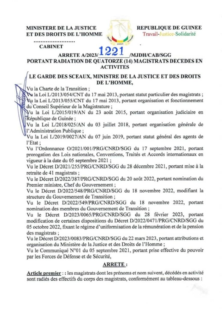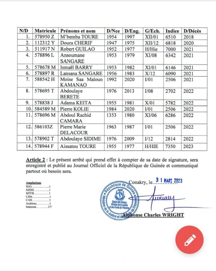 Guinée : 14 magistrats décédés en activité radiés des effectifs par le Ministre Charles Wright DROIT & JUSTICE Par Alhassane Toure Le 1 Avr, 2023 | 8 h 15 min Partager Dans un arrêté signé du ministre Alphonse Charles Wright, à la date du vendredi 31 mars 2023, le Garde des Sceaux Guinéen annonce la radiation de 14 magistrats décédés, mais en activité des effectifs du corps des magistrats. Ci-dessous communiqué: A lire aussi : Désinformation en Guinée : le Parquet Général hausse le ton… 4 Déc, 2025 | 22 h 35 min Cellou Dalein Diallo contre l’État guinéen : ses avocats… 25 Nov, 2025 | 17 h 53 min Post Views: 888 Partager :FacebookXJ’aime ça :J’aime chargement… Articles similaires Partager