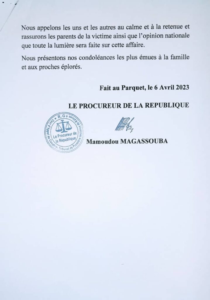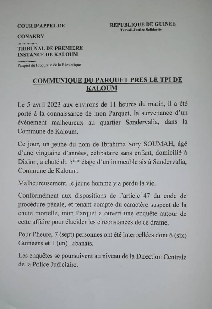 Dans un commuiqué publié ce jeudi 06 avril 2023, le parquet près le TPI de Kaloum, dans le cadre de l’assassinat du jeune Ibrahima Sory Soumah, jeté depuis le 5ème étage d’un immeuble à Sandervali, dans la commune de Kaloum, a annoncé avoir mis aux arrêts sept (7) persones dont, 6 Guinéens et 1 libanais.