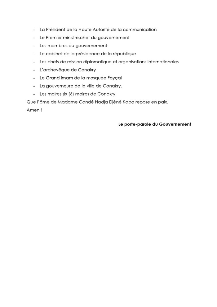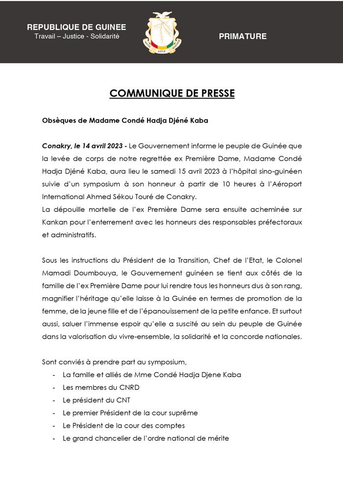 A travers un communiqué lu à télévision nationale au soir de ce vendredi 14 avril 2023, le gouvernement informe le peuple de Guinée que la levée du corps de l’ancienne première dame, madame Condé Hadja Djènè Kaba, aura lieu demain samedi 15 Avril 2023, à l’hôpital Sino Guinéen, suivie d’un symosium à son honneur à partir  de 10H à l’aéroport internationale Ahmed Sékou Touré de Conakry.
