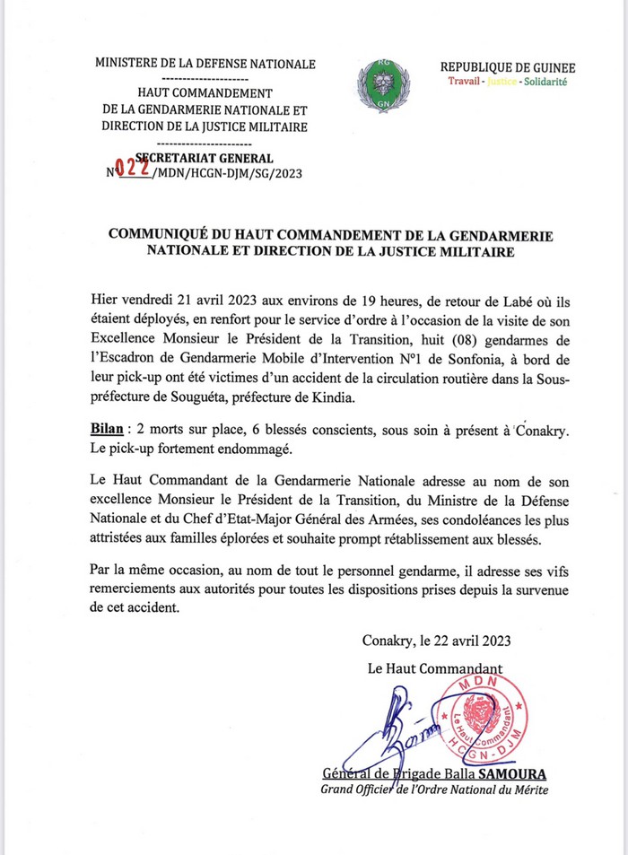 Enfin le haut commandement de la Gendarmerie nationale fait taire les rumeurs faisant état de 5 gendarmes morts par l’accident tragique survenu hier vendredi à Sougueta.