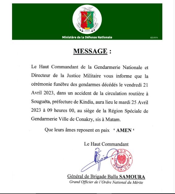 Dans un message rendu public ce lundi 24 avril 2023, le Haut Commandant de la Gendarmérie Nationale et Directeur de la Justice Militaire, a fait savoir que la cérémonie funèbre des gendarmes décédés le vendredi dernier, dans un accident de circulation à Sougueta aura lieu demain mardi 25 avril.