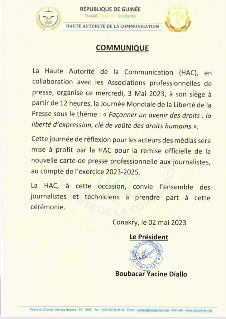 La Haute Autorité de la Communication célébrera demain mercredi 3 mai 2023 à son siège, la journée mondiale de la presse. A cette occasion, elle a à travers un communiqué dont nous avons reçu copie, informée qu’elle organise en collaboration avec les associations de la presse, une jourée de reflexion pour les acteurs des médias.