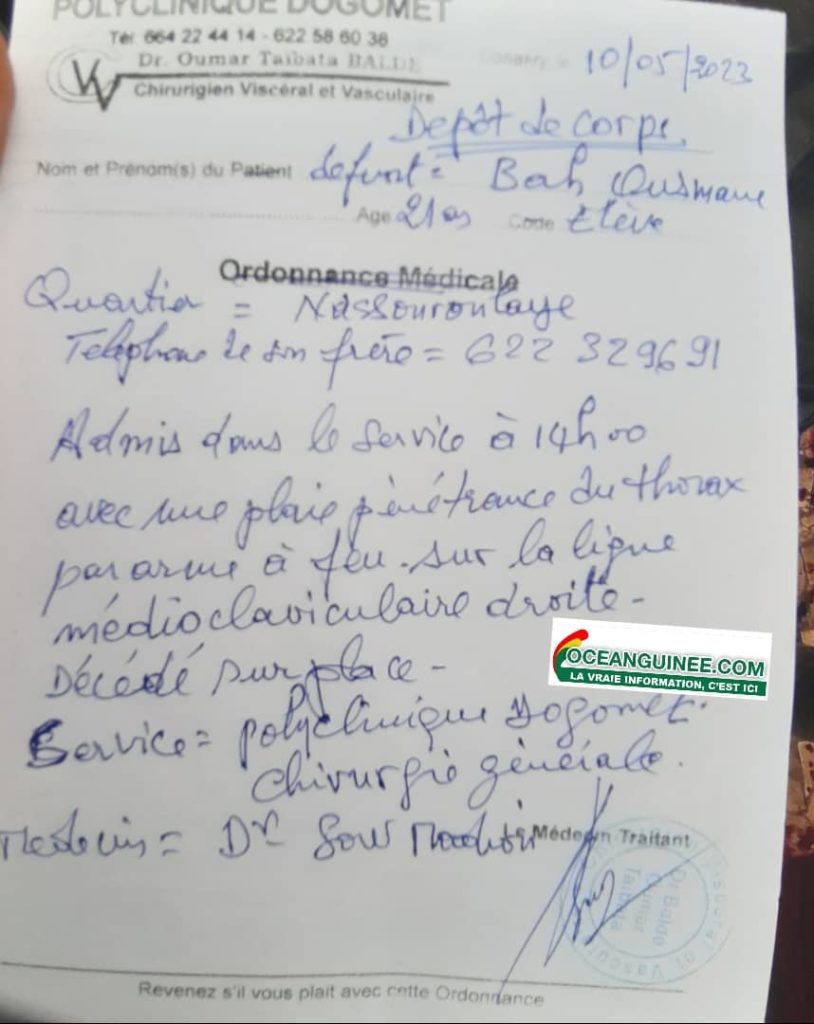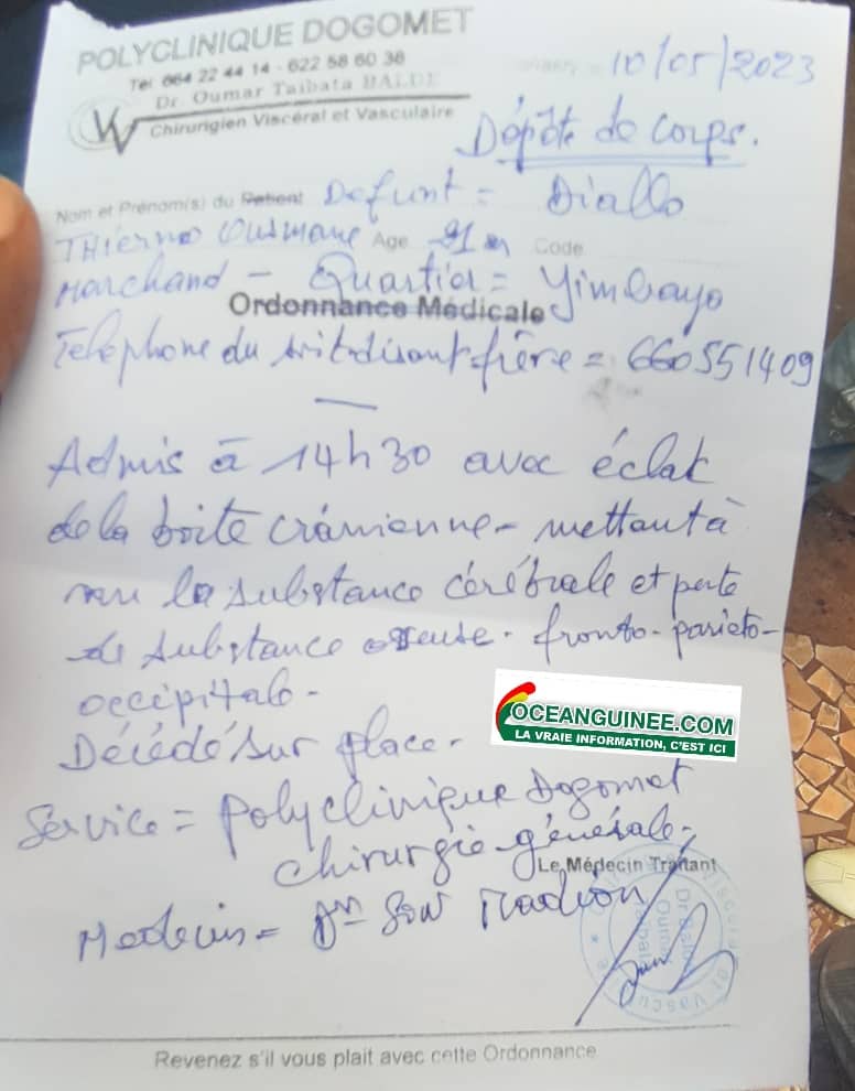 Les corps de Ousmane Bah et de Thierno Ousmane Diallo reçus à la clinique Dogomet de Cosa avant Ignace – Deen (Copies) société Par Frère Bah Le 10 Mai, 2023 | 19 h 02 min Partager Post Views: 743 A lire aussi : Pénurie de viande à Conakry : Une restauratrice alerte sur… 16 Déc, 2025 | 15 h 22 min Guinée : la HAC lève la suspension du journaliste Boubacar… 16 Déc, 2025 | 15 h 06 min Partager :FacebookXJ’aime ça :J’aime chargement… Articles similaires Partager