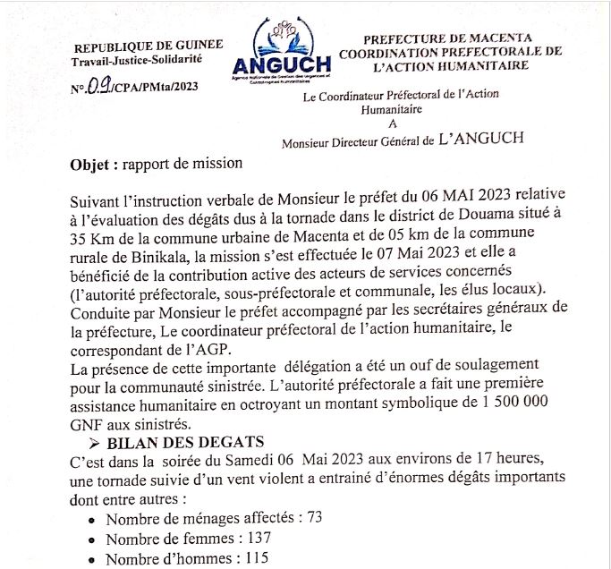 Suite à la calamité arrivée dans le village de de Douama dans la Sous-préfecture de Gbénékala, préfecture de Macenta, nous mettons à votre disposition le rapport de la coordination préfectorale de l’action humanitaire.