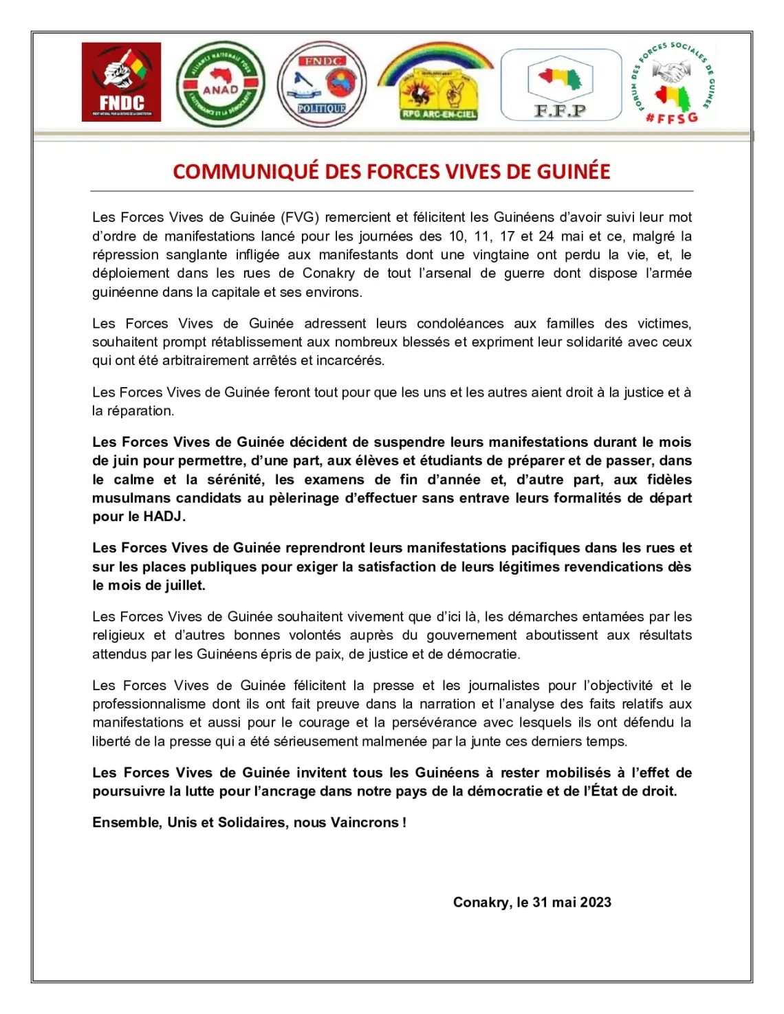Dans un communiqué publié ce mercredi 31 mai 2023, les Forces Vives de Guinée (FVG) annoncent la suspension de leurs manifestations durant le mois de juin 2023. Ce disent-elles, pour permettre, d’une part, aux élèves et étudiants de préparer et de passer, dans le calme et la sérénité, les examens de fin d’années et, d’autre part, aux fidèles musulmans candidats au pèlerinage d’effectuer sans entrave leurs formalités de départ pour le hadj.