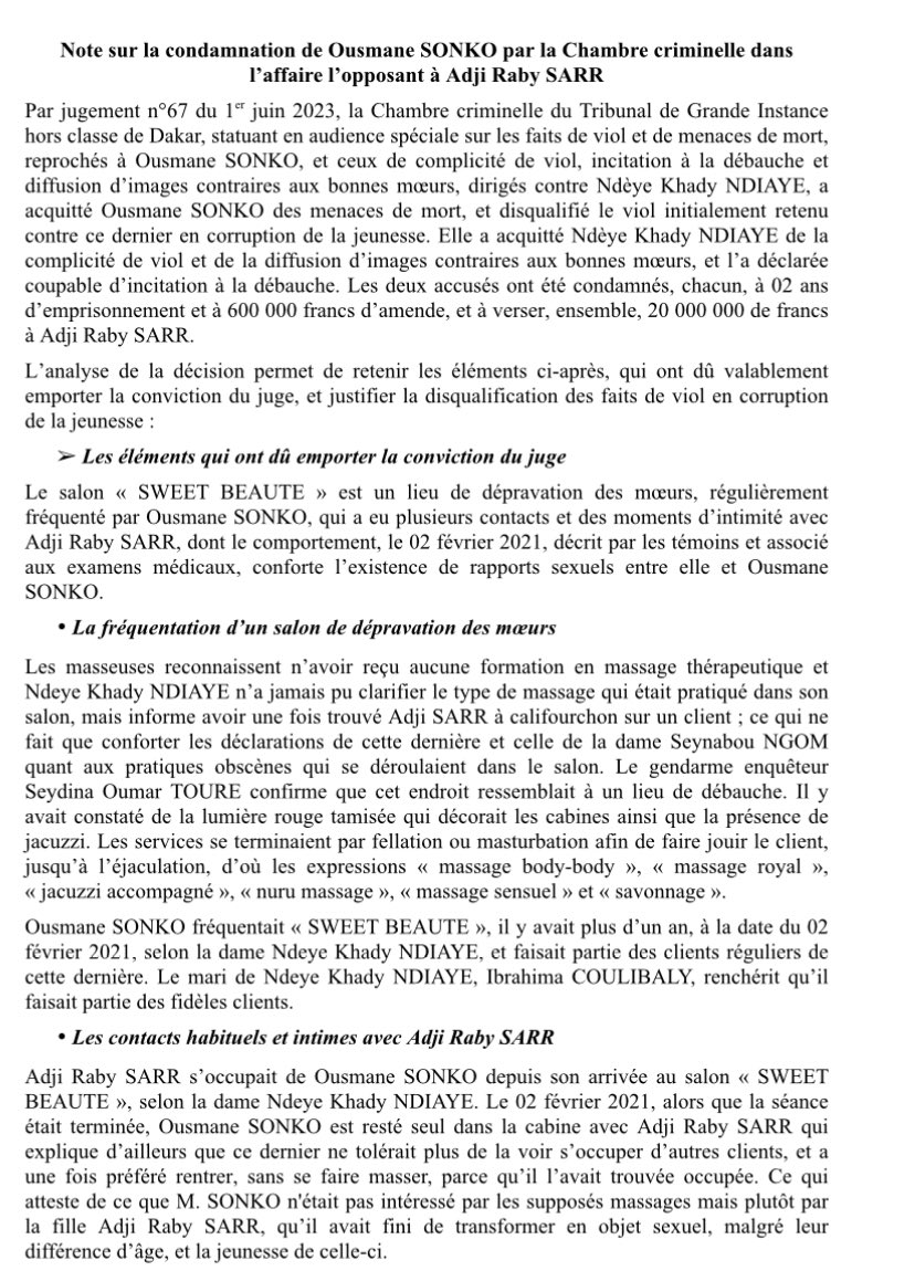Condamné par la chambre criminelle dans l’affaire Adji Sarr, l’opposant Sénégalais, Ousmane Sonko est toujours retenu à son domicile, par les agents des forces de défense et de sécurité de son pays. Et cette affaire qui a fait parler d’elle, et qui continue bien le faire, inquiète encore nombreux des citoyens du monde, surtout vivants au Sénégal. Sur ce, le ministère de la justice du Sénégal, à travers une notre dont nous avons réçus copie, a encore une fois justifié la condamnation d’Ousmane Sonko.