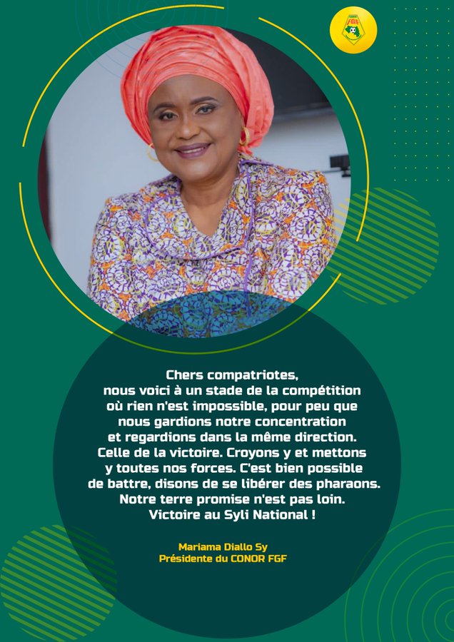 Mme Sy Mariama Satina Diallo est certaine de la victoire du Syli U23 qui compétit contre les pharaons de l’égypte pour la qualification en fianale. Elle invite à cette occasion, ses compatriotes à être dans la même optique qu’elle : ” c’est bien possible de se libérer des pharaons et la terre promise n’est pas loiné, a-t-elle fait savoir.