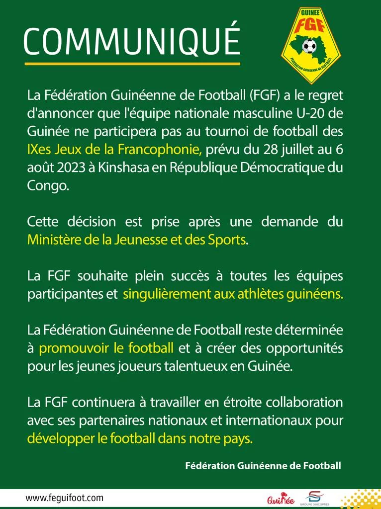 ” La Fédération Guinéenne de Football a le regret d’annoncer que l’équipe nationale masculine U-20 de Guinée ne participera pas au tournoi de football des IXes Jeux de la Francophonie, prévu du 28 juillet au 6 août 2023 à Kinshasa en République Démocratique du Congo.