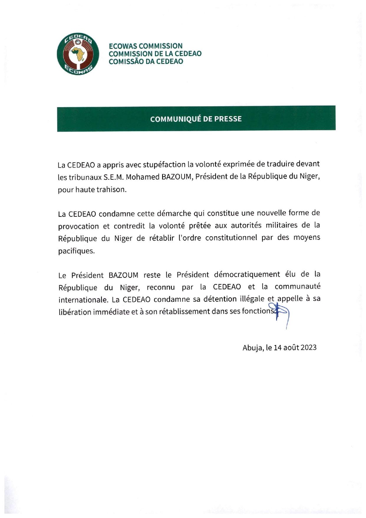 Dans un communiqué qu’elle a rendue publics ce 14 août 2023, la CEDEAO dit avoir appris avec stupéfaction la volonté exprimée par la junte de traduire devant les tribunaux le Président déchu pour « haute trahison ».