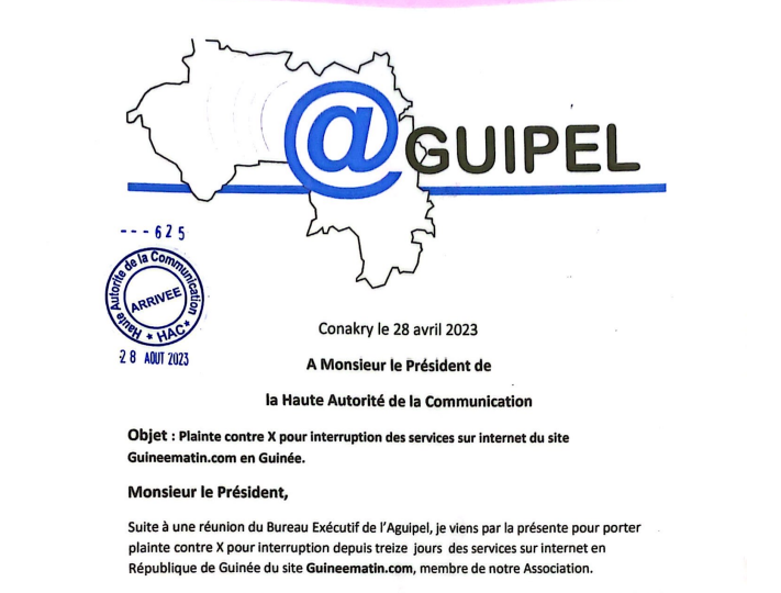 Média : l’Aguipel porte plainte contre X pour interruption des services sur internet de Guineematin.com société Par Frère Bah Le 28 Août, 2023 | 16 h 59 min Partager CamScanner 28-08-2023 11.27 A lire aussi : CBG : l’ancien DG Kémoko Touré revient au CODIR pour un… 5 Fév, 2026 | 12 h 02 min Guinée : reprise de la délivrance des extraits de naissance… 3 Fév, 2026 | 16 h 11 min Post Views: 873 Partager :FacebookXJ’aime ça :J’aime chargement… Articles similaires Partager