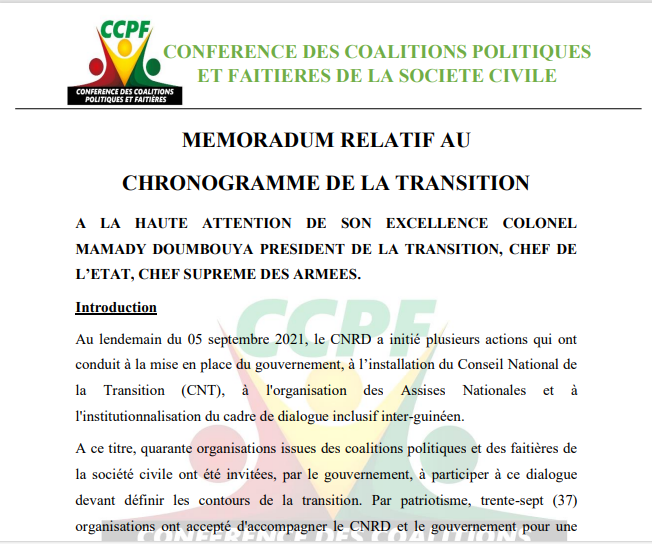 Au regard des constats susmentionnés et dans le souci d’éviter à notre pays d’éventuelles tensions dues au non-respect du calendrier défini pour le retour à l’ordre constitutionnel, nous leaders signataires de ce mémorandum avons jugé nécessaire de nous mettre ensemble pour impulser une dynamique de réflexions et de propositions de solutions pour une meilleure finalisation de la Transition.