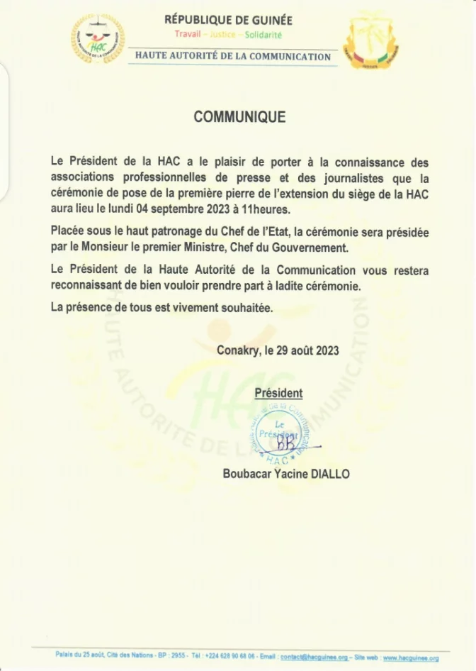 Dans un communiqué transmis à notre rédaction ce jeudi, 31 août 2023, monsieur Boubacar Yacine Diallo, Président de la Haute autorité de la Communication (HAC), informe les associations professionnelles de presse, que la cérémonie de pose de la première pierre de l’extension du siège de l’institution, aura lieu le lundi 04 septembre 2023, à 11heures.