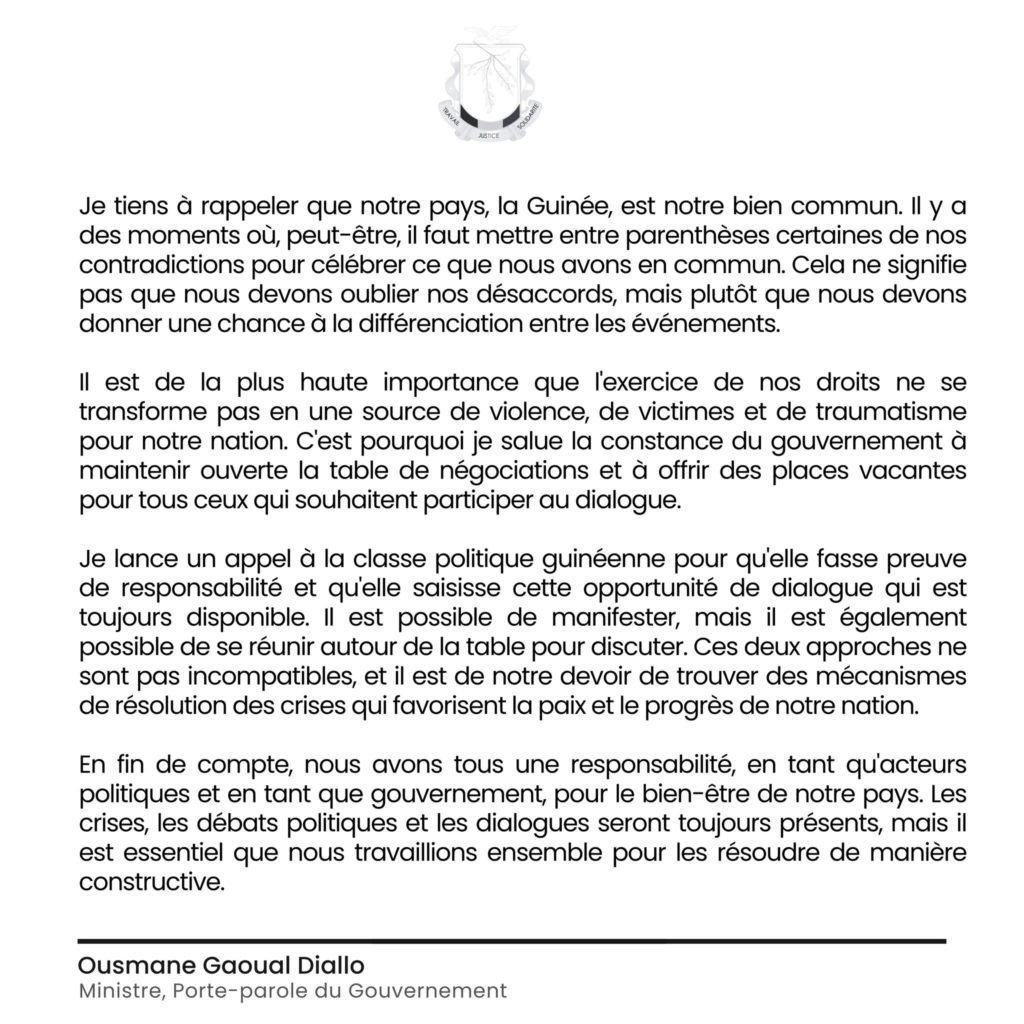 ” Je tiens à rappeler que notre pays, la Guinée, est notre bien commun. Il y a des moments où, peut-être, il faut mettre entre parenthèse certaines de nos contradictions pour célébrer ce que nous avons en commun….”