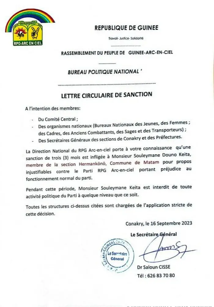 Dans une note circulaire dont nous avons reçus copie, le RPG Arc-En-Ciel à travers son Secrétaire général a infligé trois (3) mois de sanction à Monsieur Souleymane Douno Keita, membre de la section Hermankönö, Commune de Matam pour propos injustifiables contre le Parti.