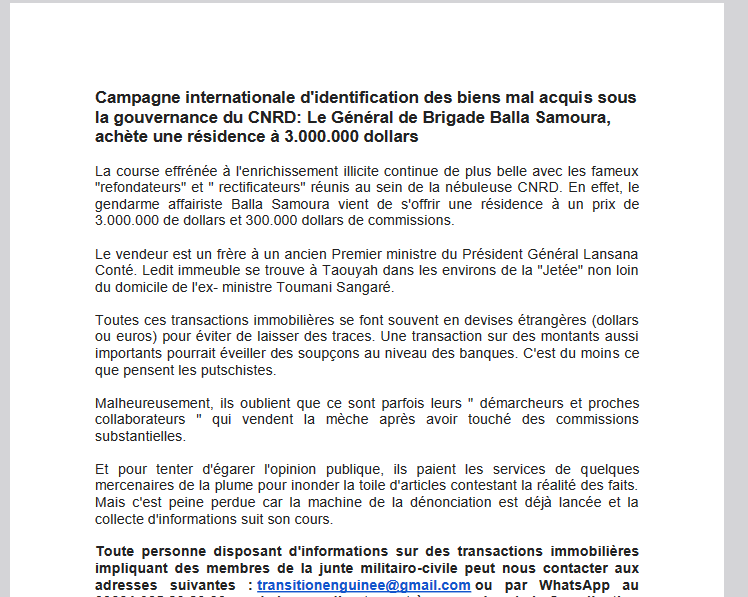 Toute personne disposant d’informations sur des transactions immobilières impliquant des membres de la junte militairo-civile peut nous contacter aux adresses suivantes : transitionenguinee@gmail.com ou par WhatsApp au 00224 625 80 80 90 ou s’adresser directement à un membre de la Coordination Nationale du FNDC.