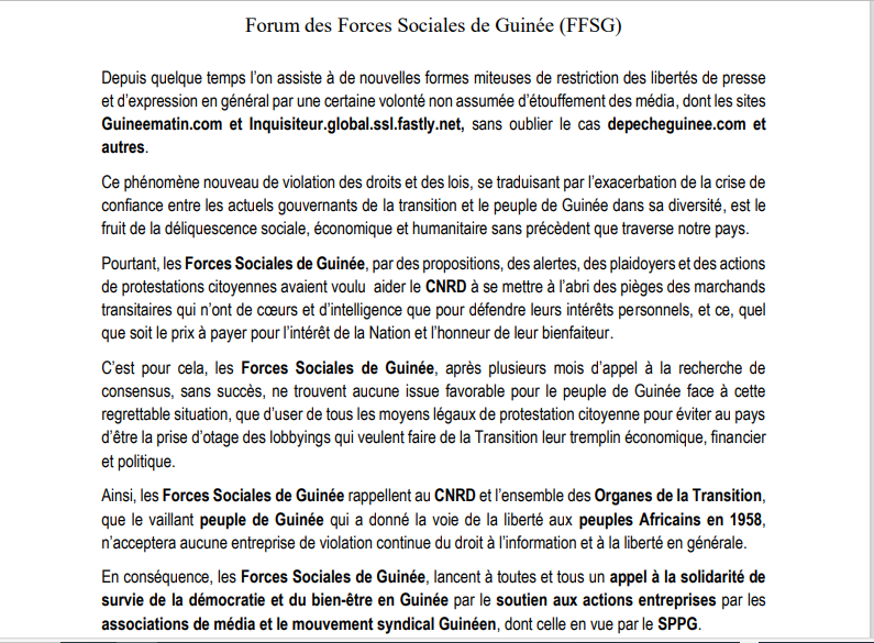 Dans une déclaration rendue publique hier samedi 14 octobre, le FFSG a lancé un appel de soutient et à la solidarité pour la survie de la démocratie et du bien-être en Guinée par le soutien aux actions entreprises par les associations de média et le mouvement syndical Guinéen, dont celle en vue par le SPPG pour le lundi 16 octobre prochain pour exiger la levée de la restriction imposée au site d’informations Guineematin.com, depuis plusieurs semaines.