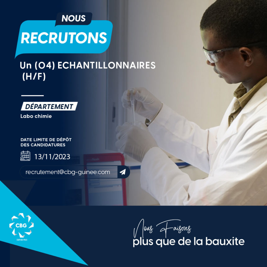 Dans le cadre de ses activités, la Compagnie des Bauxites de Guinée (CBG) S.A recherche pour son site de Kamsar Quatre (04) échantillonneurs.