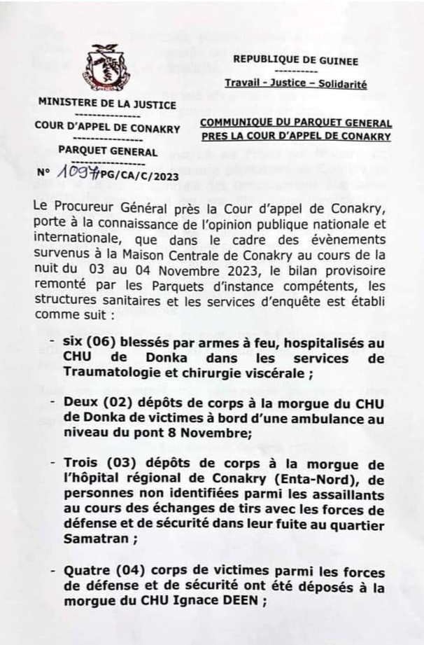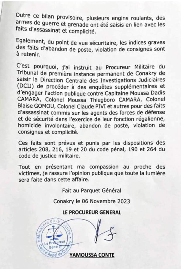 Soixante douze heures après leurs evasion de la paisin cebtra de Conakry, le procureur général instruit au procureur militaire permanent de Conakry d’engager l’action publique contre l’ancien chef de junte Guinéen, le Capitaine Dadis Camara, et cie pour des faits d’assassinat contre les agents de défense et de sécurité.