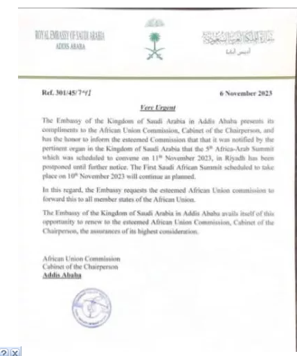 A travers une lettre officielle estampillée « Très urgent » adressée à la Commission de l’Union Africaine (UA), l’Ambassade d’Arabie-Saoudite à Addis-Abeba (Ethiopie) a informé du report à une date ultérieure du 5è Sommet Arabo-Africain prévu pour samedi 11 novembre 2023.