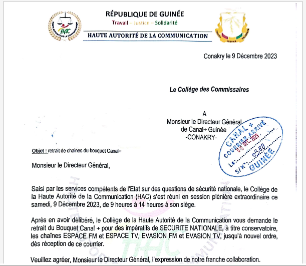 Dans un courrier adressé au DG de Canal+Guinée, le collège des commissaires de la Haute Autorité de la Communication (HAC) a demandé le retrait du bouquet Canal+ pour dit-il « impératifs de SECURITTE NATIONALE, à titre conservatoire, les chaînes Espace fm, Espace Tv, Évasion fm et Évasion tv jusqu’à nouvel ordre », et cela dès reception du courrier.