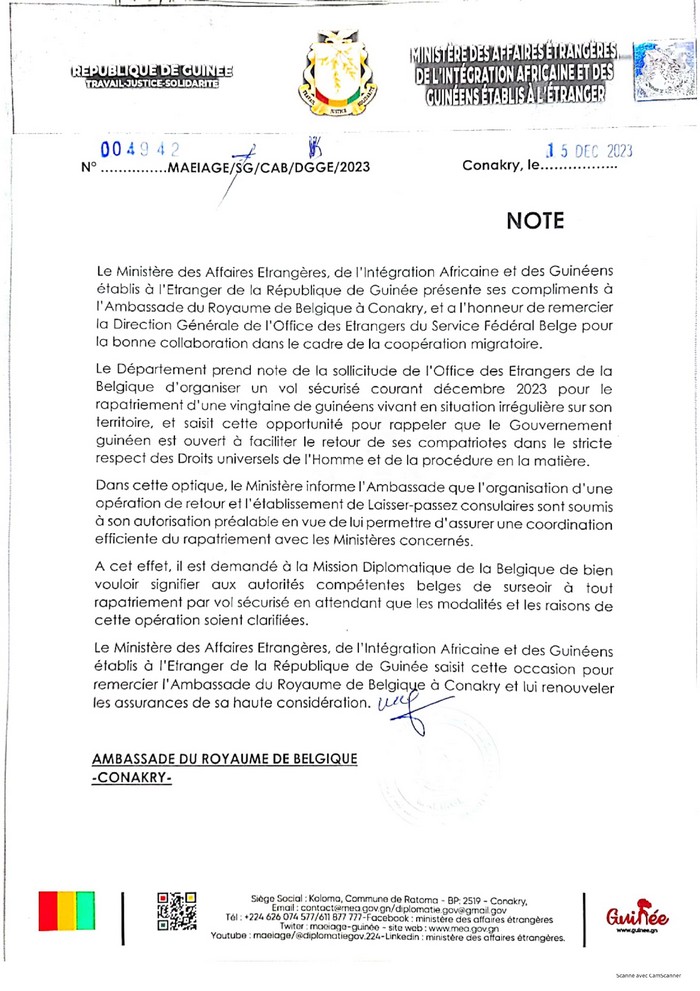 Dans une note verbale adressée à l’Ambassade du Royaume de Belgique à Conakry, le Ministère des affaires étrangères demande à Bruxelles de surseoir à tout rapatriement par vol sécurisé en attendant que les modalités et les raisons de cette opération soient clarifiées.