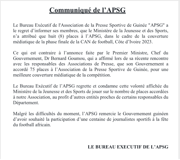 CAN 2023 : en colère, l’APSG dénonce des manoeuvres du Ministère du sport à l’enroit de la presse sportive Sport Par Alhassane Toure Le 11 Jan, 2024 | 10 h 18 min Partager Communique-APSG-2 A lire aussi : Kamsar : un week-end sportif sous le signe de la cohésion… 2 Fév, 2026 | 10 h 53 min Lourdes sanctions après les incidents de la finale de la CAN… 29 Jan, 2026 | 9 h 05 min Post Views: 1 039 Partager :FacebookXJ’aime ça :J’aime chargement… Articles similaires Partager