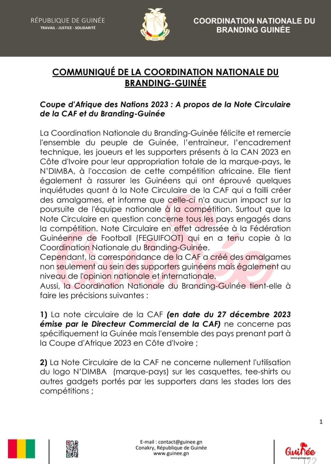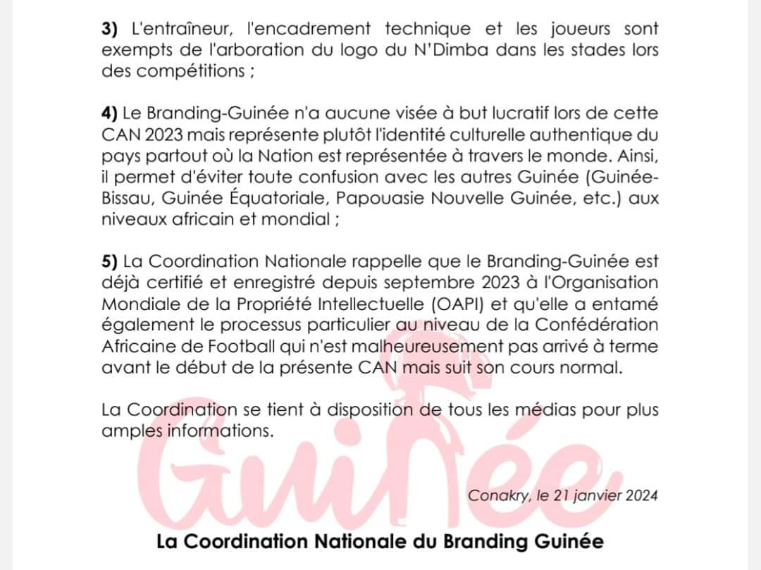 Depuis quand le Branding Guinéen a une coordination nationale ? Des citoyens s’interrogent Politique Par Alhassane Toure Le 21 Jan, 2024 | 23 h 20 min Partager Dans une note que nous avons reçu, et dans laquelle se trouve écrit, ” la coordination nationale du Branding Guinée “, il a été dit ce qui suit. Voir image ci-dessous : A lire aussi : Elections communales : la DGE officialise la liste… 23 Avr, 2026 | 16 h 42 min Mamou accueille un atelier national stratégique sur les… 23 Avr, 2026 | 10 h 45 min Post Views: 827 Partager :FacebookXJ’aime ça :J’aime chargement… Articles similaires Partager
