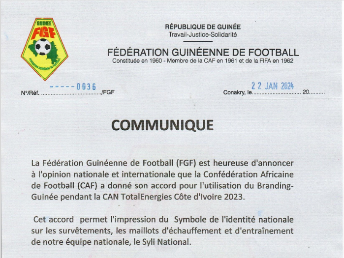 La CAF donne son accord à la Guinée d’utiliser son branding national pendant la CAN 2023 ( Communiqué) Sport Par Alhassane Toure Le 22 Jan, 2024 | 17 h 35 min Partager 0036-22.01.2024-Communique-Accord-pour-lutilisation-du-Branding-Guinee-pour-la-CAN-TotalEnergies-Cote-dIvoire-2023 A lire aussi : Ligue des champions : Serhou Guirassy entre dans l’histoire… 25 Nov, 2025 | 23 h 31 min Ballon d’Or africain 2025 : la mise à l’écart de Serhou… 17 Nov, 2025 | 9 h 46 min Post Views: 1 235 Partager :FacebookXJ’aime ça :J’aime chargement… Articles similaires Partager