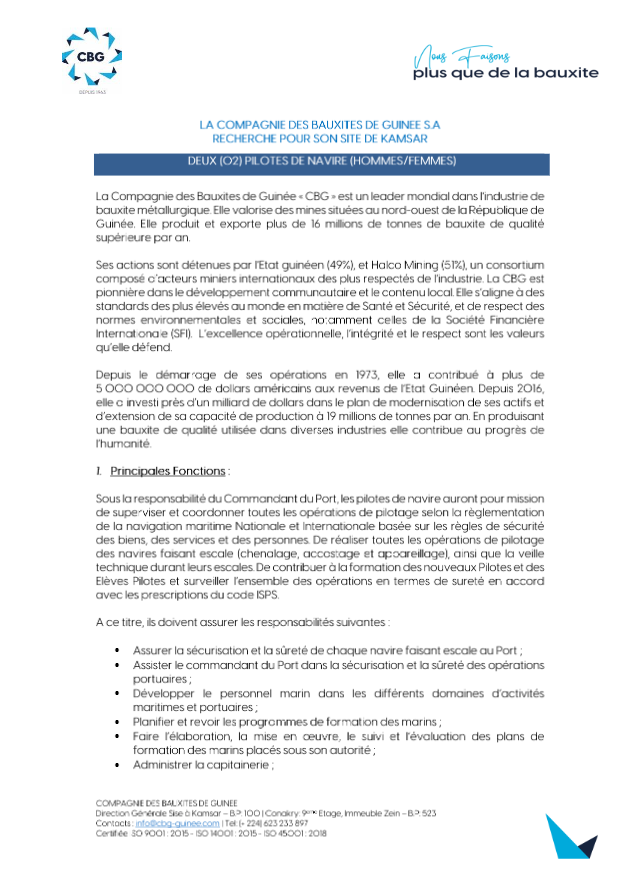 Dans le cadre de ses activités, la CBG recrute deux (02) pilotes de navire pour son site de Kamsar.