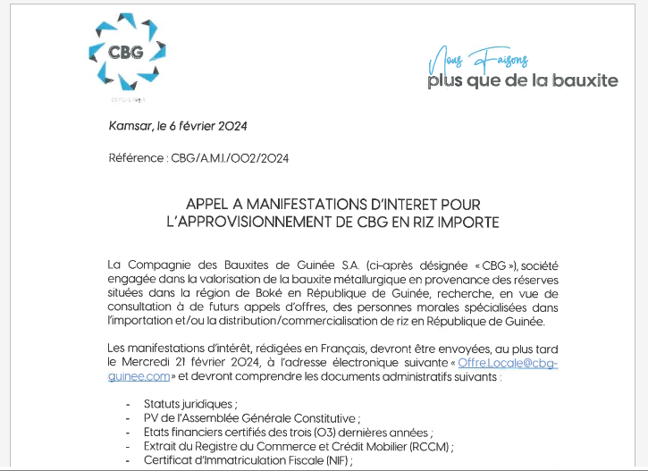 La Compagnie de Bauxite de Guinée – SA, société engagée ans la valorisation de la bauxite en provénance des réserves situées dans la Région de Boké, dans la République de Guinée récherche en vue de consultation à des futurs appels d’offres, des personnes morales spécialisées dans l’importation et ou à la commercialisation/commercialisation de riz en République de Guinée.
