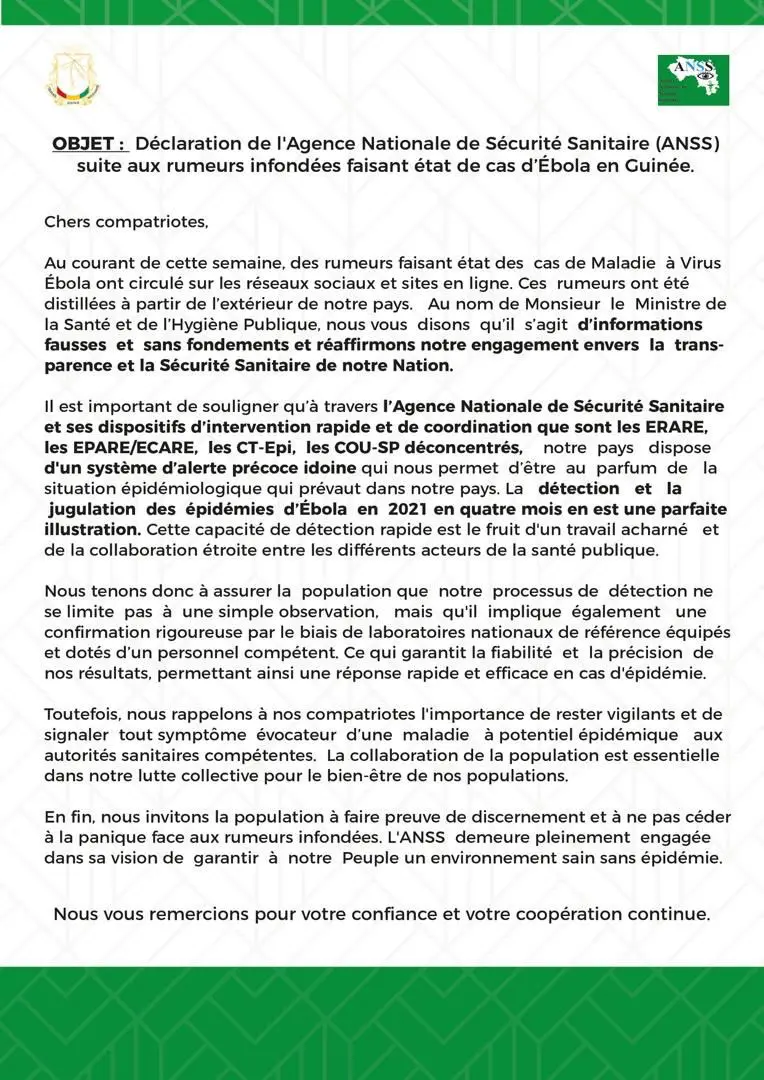 Guinée : l’ANSS dément l’information selon laquelle, la maladie à virus Ebola a fait son retour en Guinée (Copie)